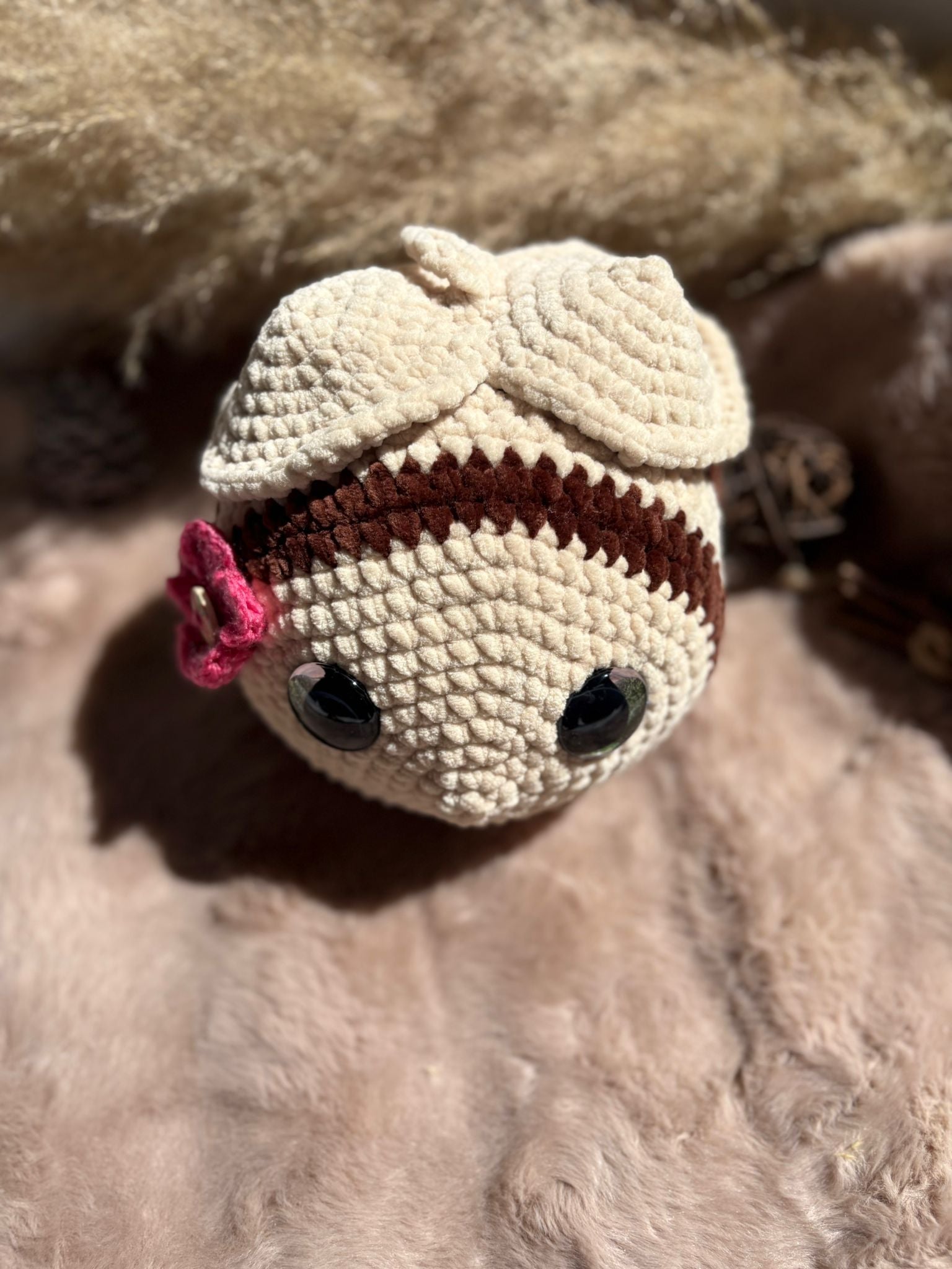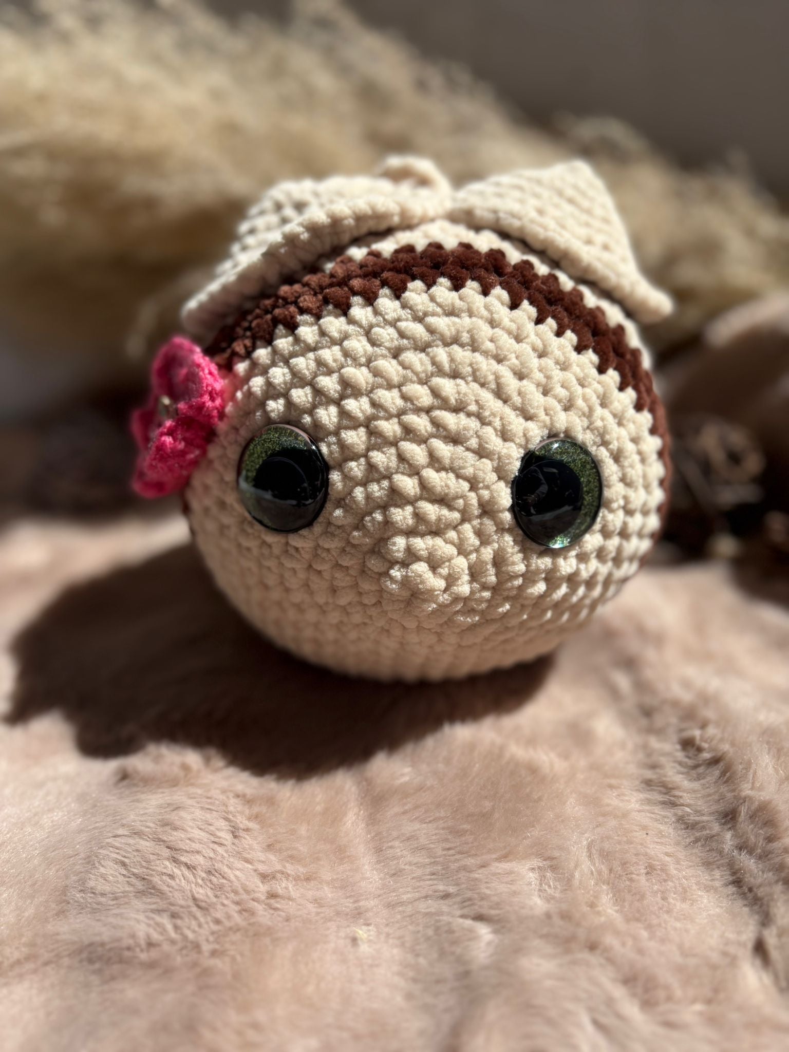 Aus weicher Samtwolle gehäkelt und mit Füllwatte gefüllt, die Sicherheitsaugen sind sehr fest und können nicht gelöst werden.